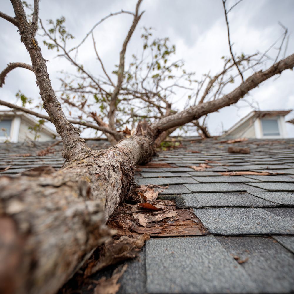 Falling branches or debris: Visible punctures, broken shingles, or holes in the roof.